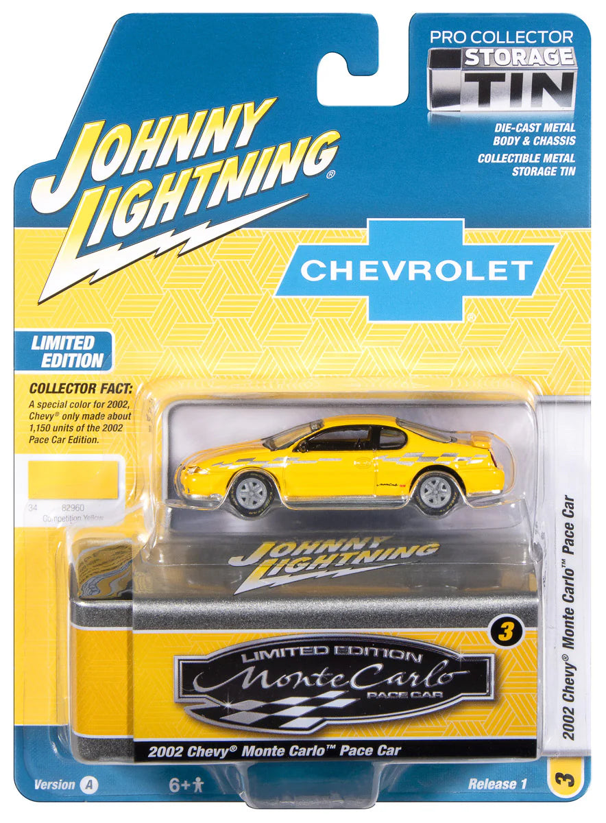 2002 Chevy Monte Carlo Pace Edition Competition Yellow w/Silver Graphics w/ Collector Tin Diecast 1:64 Scale Model - Johnny Lightning JLCT020