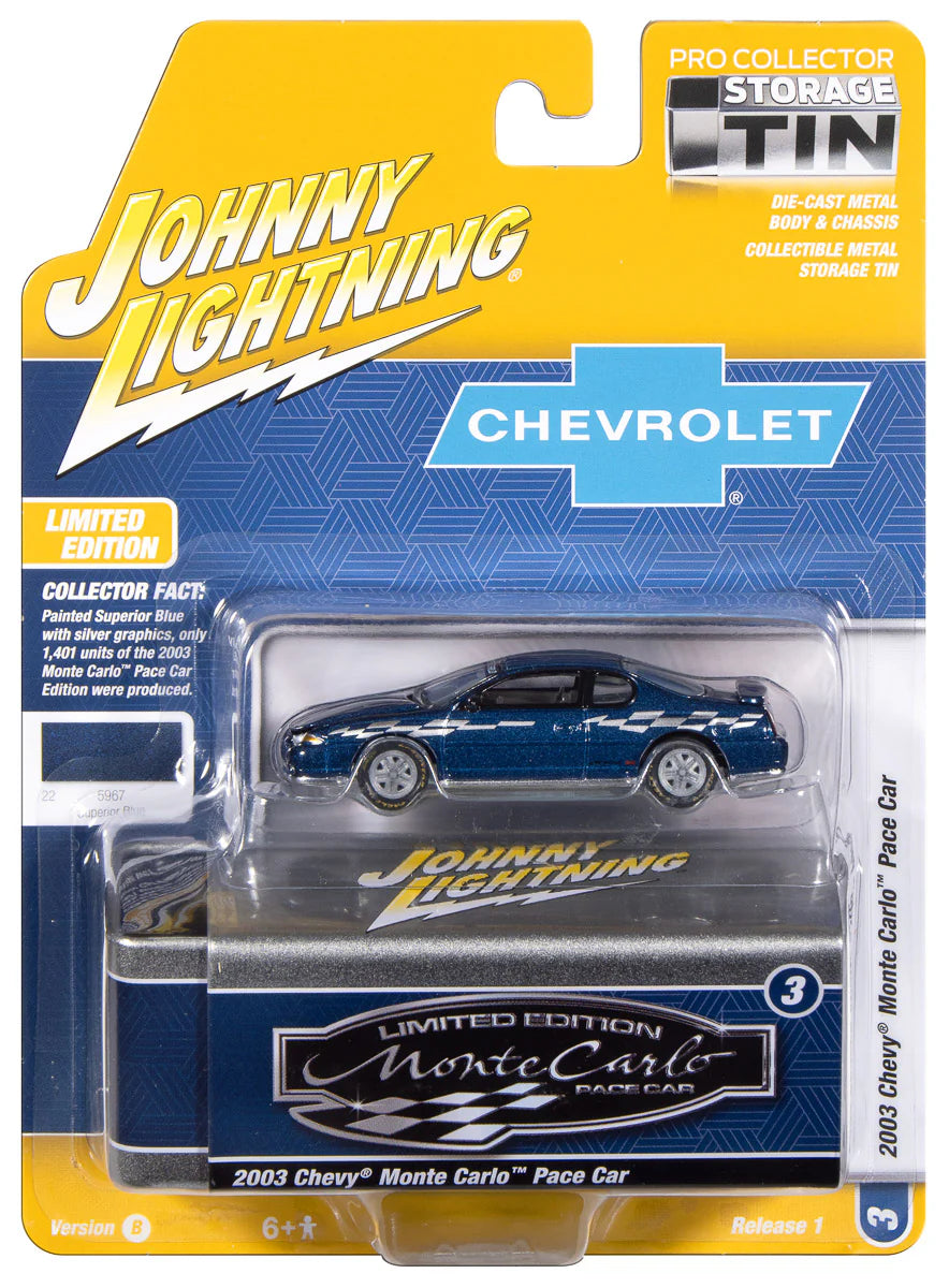2002 Chevy Monte Carlo Pace Edition Superior Blue w/ Silver Graphics w/ Collector Tin Diecast 1:64 Scale Model - Johnny Lightning JLCT020