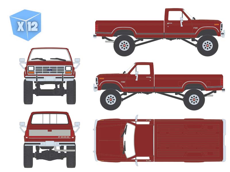 PRE-ORDER - 12 PACK 1985 Ford F-250 XLT 4x4 Long Bed Dark Canyon Red Diecast 1:64 Scale Model - Karson Diecast Co. IAPR1031