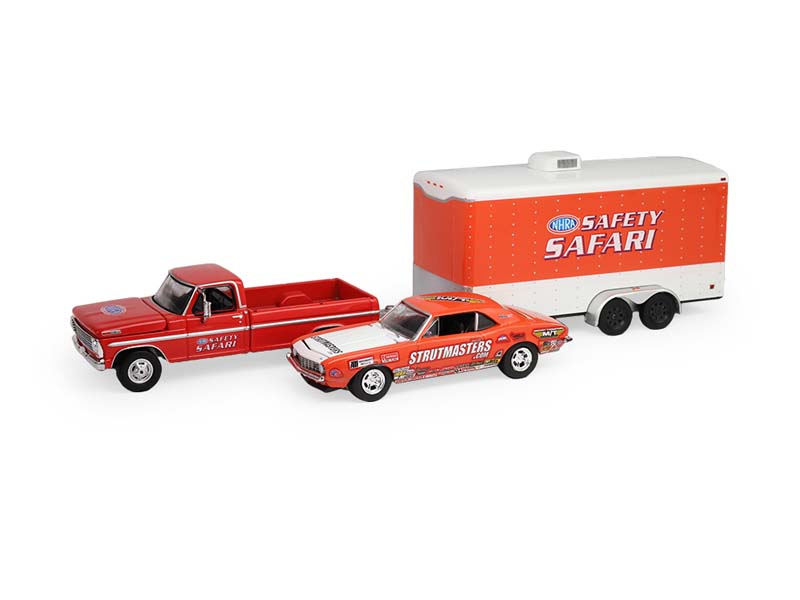 PRE-ORDER 1969 Ford F-250 and 1969 Chevy Z/28 Camaro w/ Enclosed Hauler Safety Safari (Racing Hitch & Tow Series 6) Diecast 1:64 Scale Model - Greenlight 31190A
