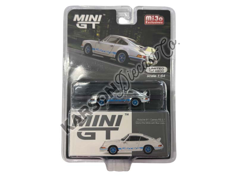 CHASE Porsche 911 Carrera RS 2.7 Grand Prix – White w/ Blue Livery (Mini GT) Diecast 1:64 Scale Model - TSM MGT00715