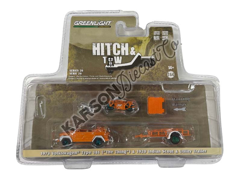 1973 Volkswagen Thing (Type 181) and Utility Trailer w/ 1920 Indian Scout (Hitch & Tow) Series 26 Diecast 1:64 Model – Greenlight
