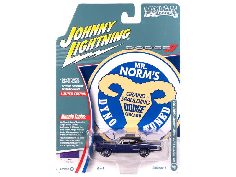 1970 Dodge Coronet Super Bee - Plum Crazy w/ Flat Black Roof and White Stripes Diecast 1:64 Scale Model - Johnny Lightning JLMC034B
