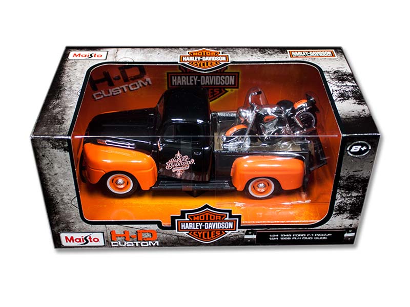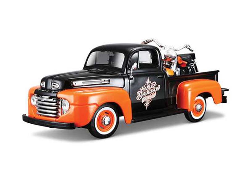 1948 Ford F-1 Truck Orange & Black w/ 1958 Harley Davidson FLH Duo Glide Diecast 1:24 Scale Model – Maisto