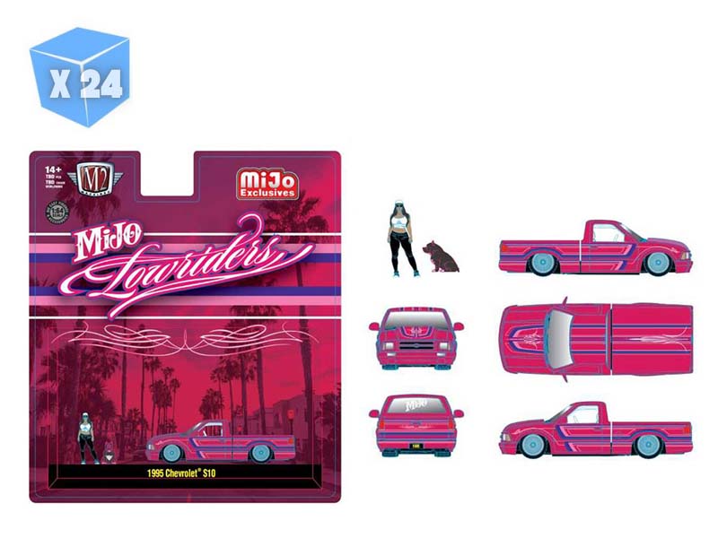 PRE-ORDER - 24 PACK 1995 Chevrolet S10 Lowriders w/ Girl & Pitbull Dog Figures – Pink Diecast 1:64 Scale Model - M2 Machines 67500-MJS05