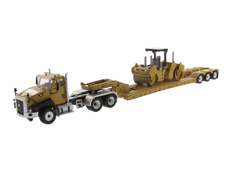 CAT Caterpillar CT660 Day Cab with XL 120 Low-Profile HDG Lowboy Trailer & CAT Caterpillar CB-534D XW Vibratory Asphalt Compactor & Operator (Core Classics) 1:50 Scale Model - Diecast Masters
