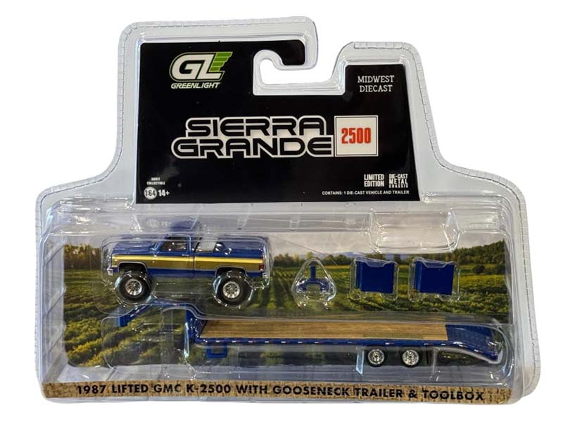 1987 GMC Sierra K-2500 Lifted w/ Gooseneck Trailer Blue / Gold (Midwest Diecast) Diecast 1:64 Scale Model - Greenlight 51653A