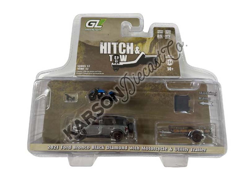 RAW CHASE 2021 Ford Bronco Black Diamond Blue Metallic w/ Trailer & Motorcycle - (Hitch & Tow Series 32) Diecast 1:64 Scale Model - Greenlight 32320C