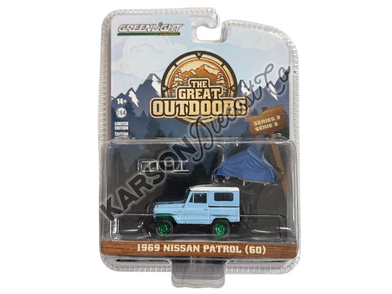1969 Nissan Patrol (60) - Blue & White w/ Camp'otel Cartop Sleeper Tent (The Great Outdoors) Series 3 Diecast 1:64 Scale Model – Greenlight