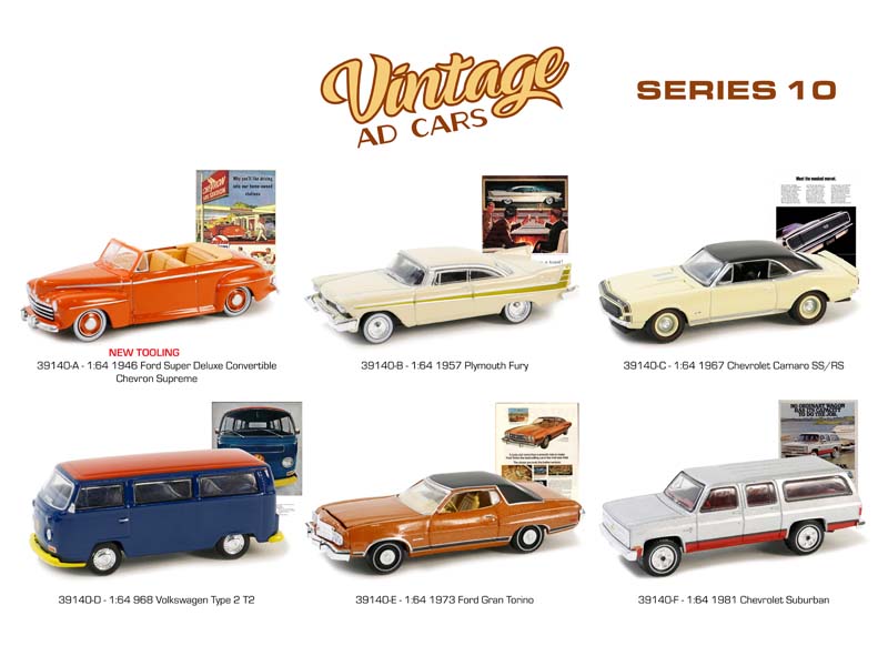 (Vintage Ad Cars Series 10) SET OF 6 Diecast 1:64 Scale Models - Greenlight 39140